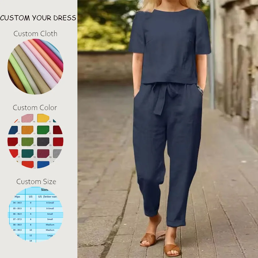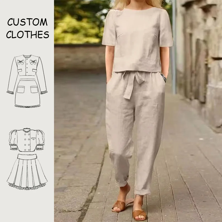 Custom Logo Solid Summer Two Piece Women's Linen/Cotton Knit for Shorts Set OEM Service XXS Available